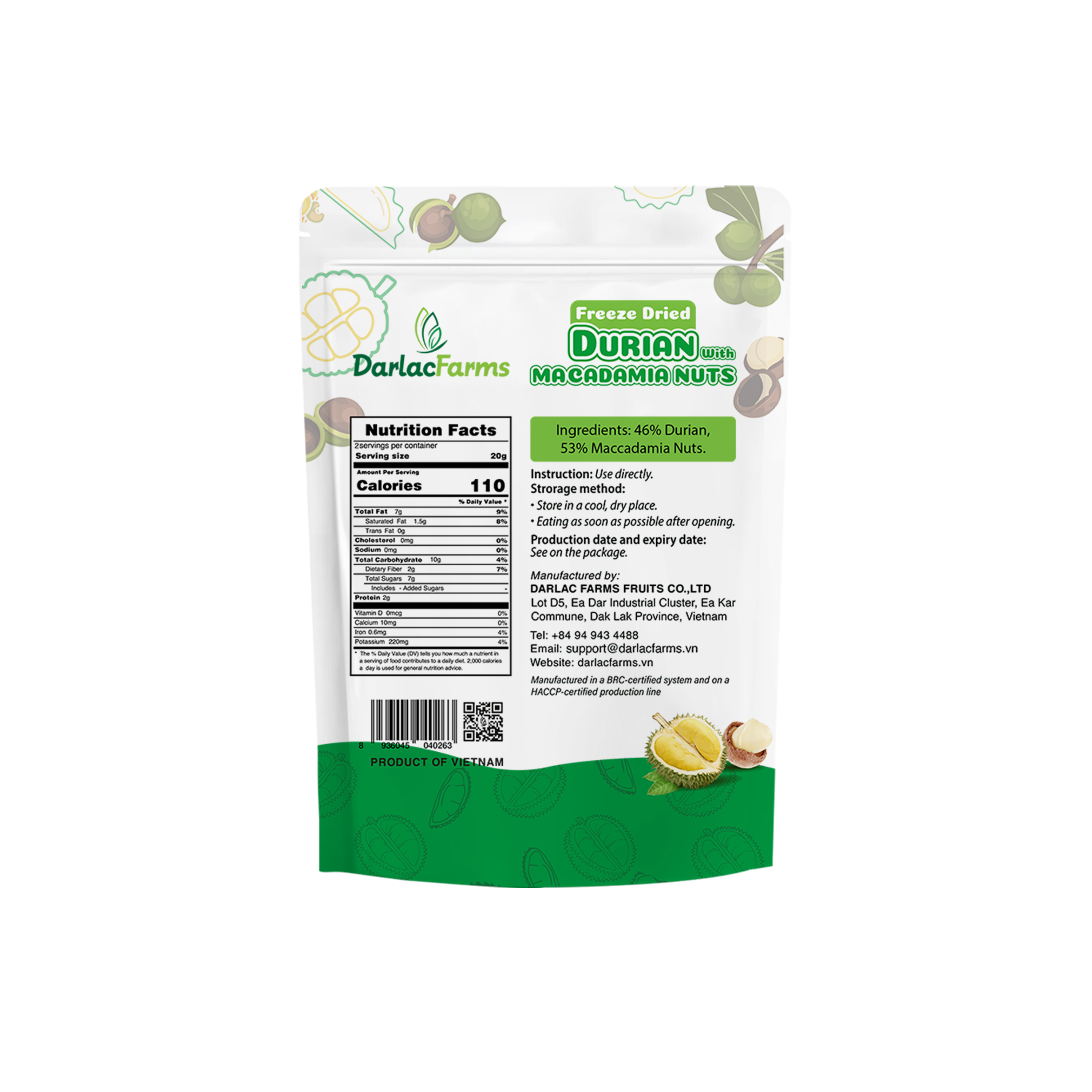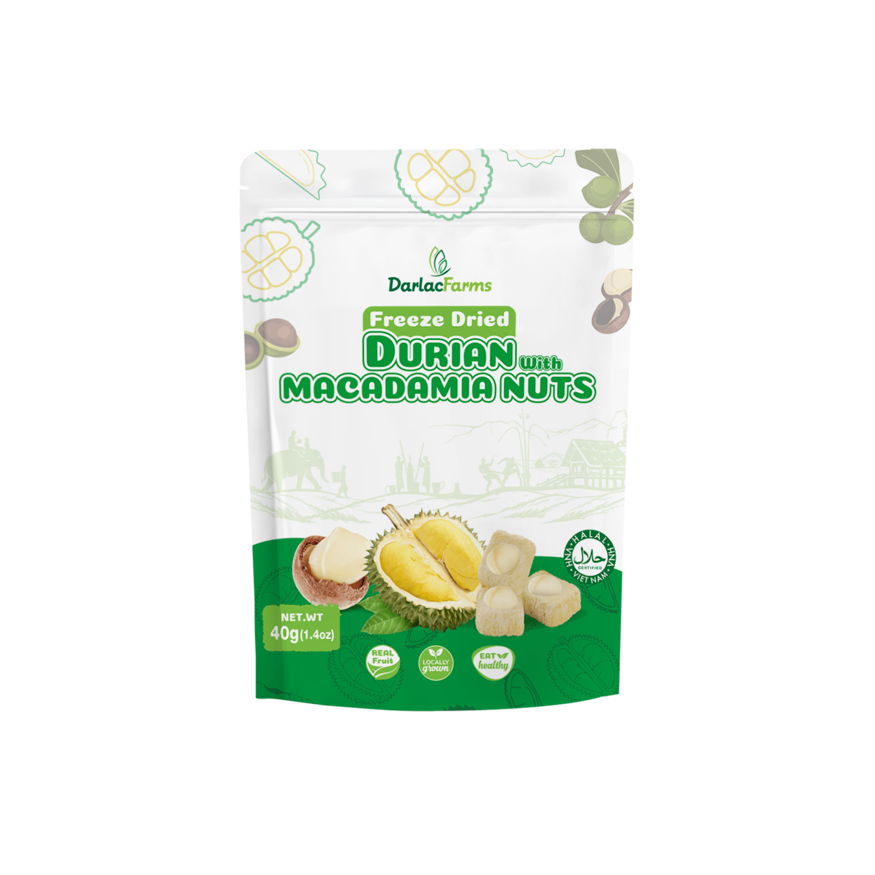Sầu riêng hạt mắc ca sấy thăng hoa là dòng sản phẩm cao cấp, kết hợp giữa sầu riêng chín tự nhiên và hạt mắc ca tuyển chọn, được xử lý bằng công nghệ sấy thăng hoa tiên tiến. Quy trình này giúp giữ nguyên hương vị sầu riêng đậm đà, vị béo bùi đặc trưng của mắc ca cùng hàm lượng dưỡng chất cao như axit béo không bão hòa, omega, vitamin và khoáng chất. Sản phẩm có kết cấu giòn xốp, vị béo thanh và hậu vị sang trọng, phù hợp cho phân khúc thực phẩm cao cấp và thị trường xuất khẩu quốc tế.